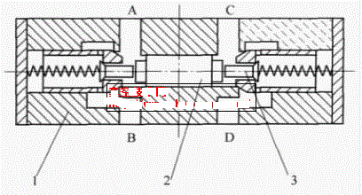雙向液控單向閥的結(jié)構(gòu)如圖所示。它由兩個液控單向閥組成,共用一個閥體1 和控制活塞2。當(dāng)通口A通壓力油時,通口A和B相通,同時油液又使右閥打開,保持通口C和D相通。同樣,當(dāng)通口C通壓力油時,通口C和D相通,通口A和B也相通。而當(dāng)通口A和C 都不通壓力油時,B和D被兩個單向閥封閉,執(zhí)行元件被雙向鎖住。